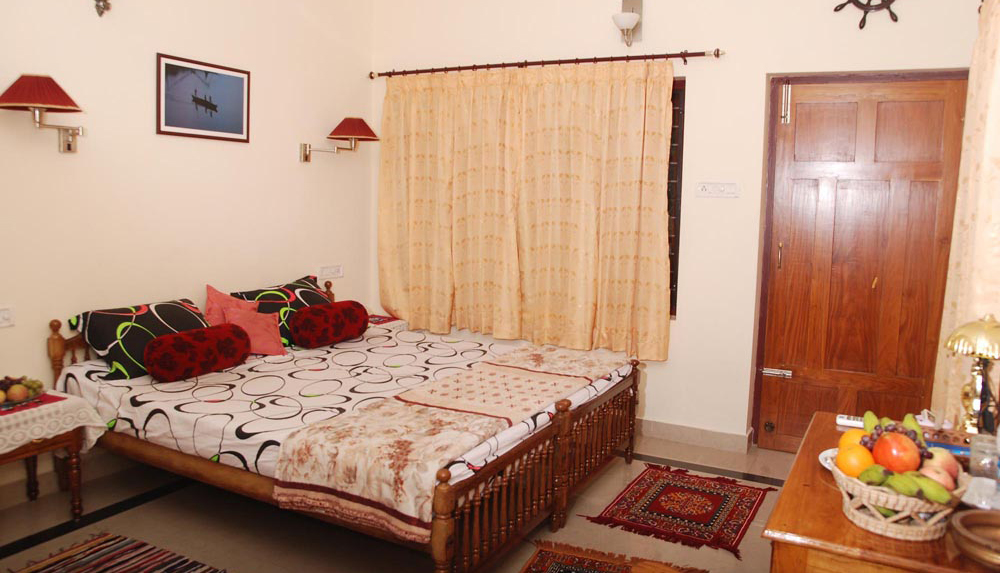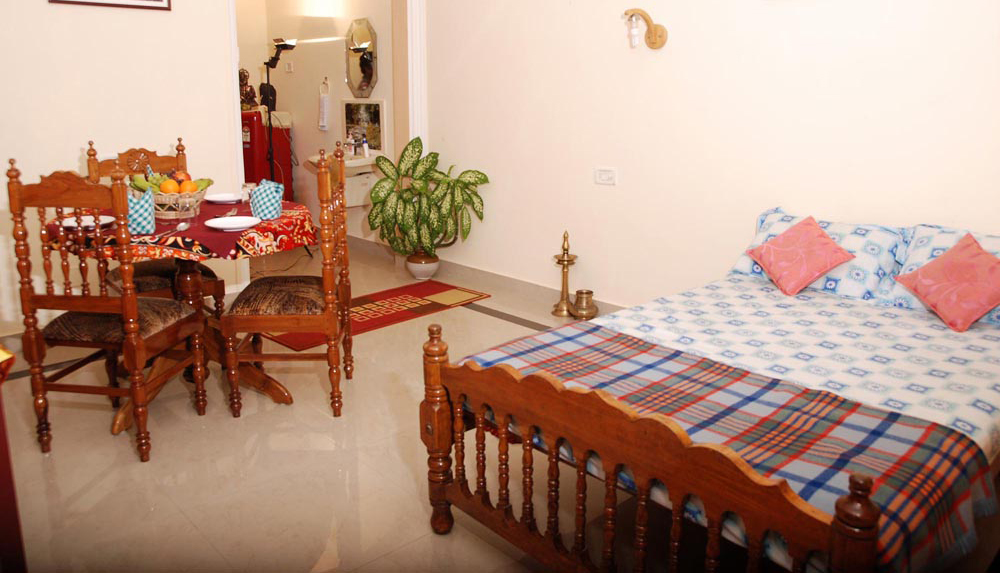 “DEVI KRIPA” in Malayalam translates to “Grace of the Goddess”, 5 Km north of world- renowned Kovalam beach and just 7 kms from the state capital Thiruvananthapuram, walkable distance from Pozhikara beach ( Lagoona beach) and Thiruvallam backwater stretch. A pleasant 10 minute drive from the International airport via Kovalam – NH bypass road brings you here Devikripa has two villas set in 30 cents among the swaying coconut palms. One Villa occupied by the host & family and the other villa having 100 sq. mtr(1076 sq. feet) area, double storied with serene panorama all around. The villa is furnished and equipped with a range of facilities and comforts designed to make you feel at home. Spacious sit out area where you can relax, guest lounge and dining space where you can watch, TV, DVD as well as enjoy music also. A fridge stocked with drinks and snacks, modular kitchen with optional self cooking facility , tea and coffee making facilities and comfort list goes on…… The Vastu designed master bedroom has spacious balcony and built in wardrobes. Ensuite bathroom with hot and cold water and all modern amenities.